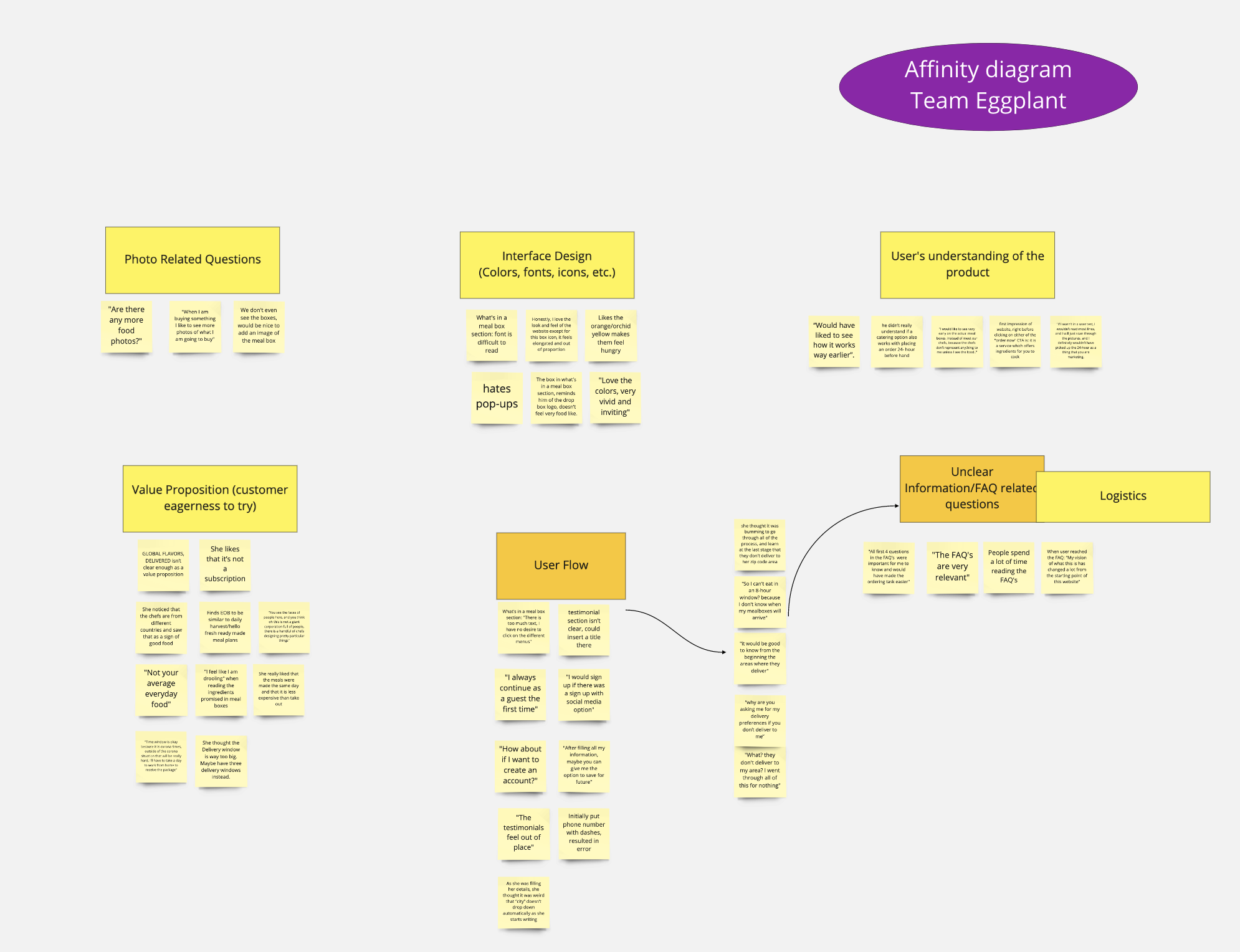 I had already written down the insights from my research in Miro. I then split the participants into two teams and asked them to group the insights into clusters and give a title to each cluster.